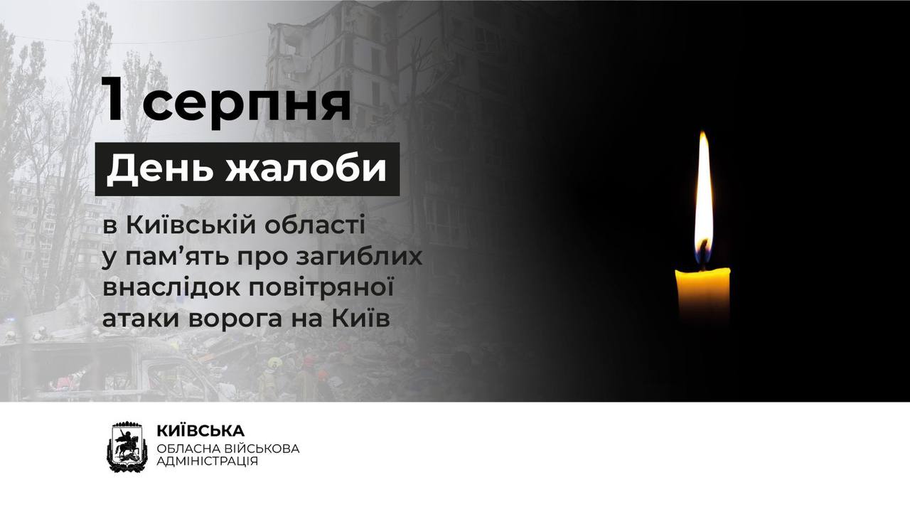 У Київській області 1 серпня оголошено День жалоби за загиблими внаслідок чергового акту російського терору в Києві.
